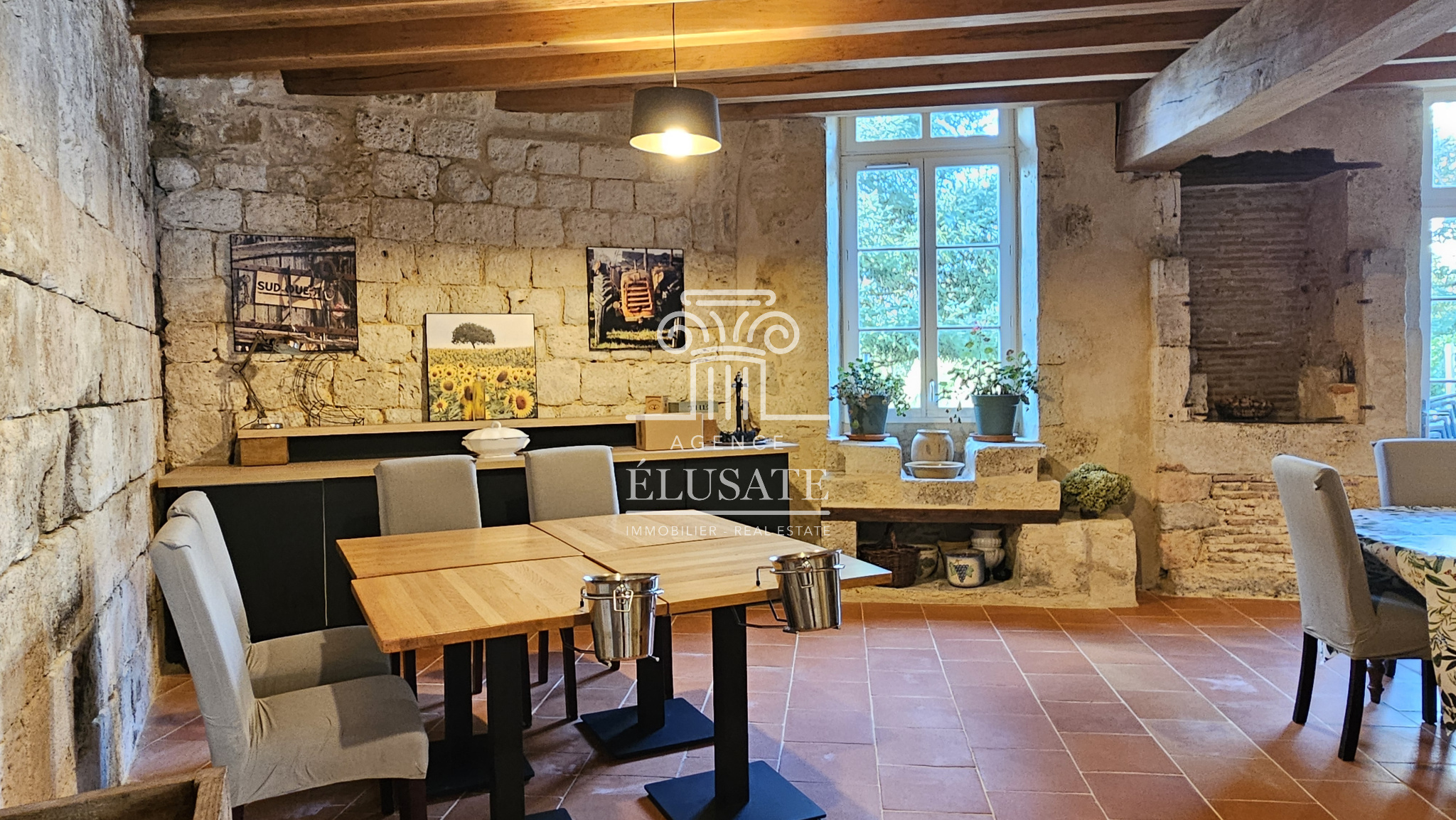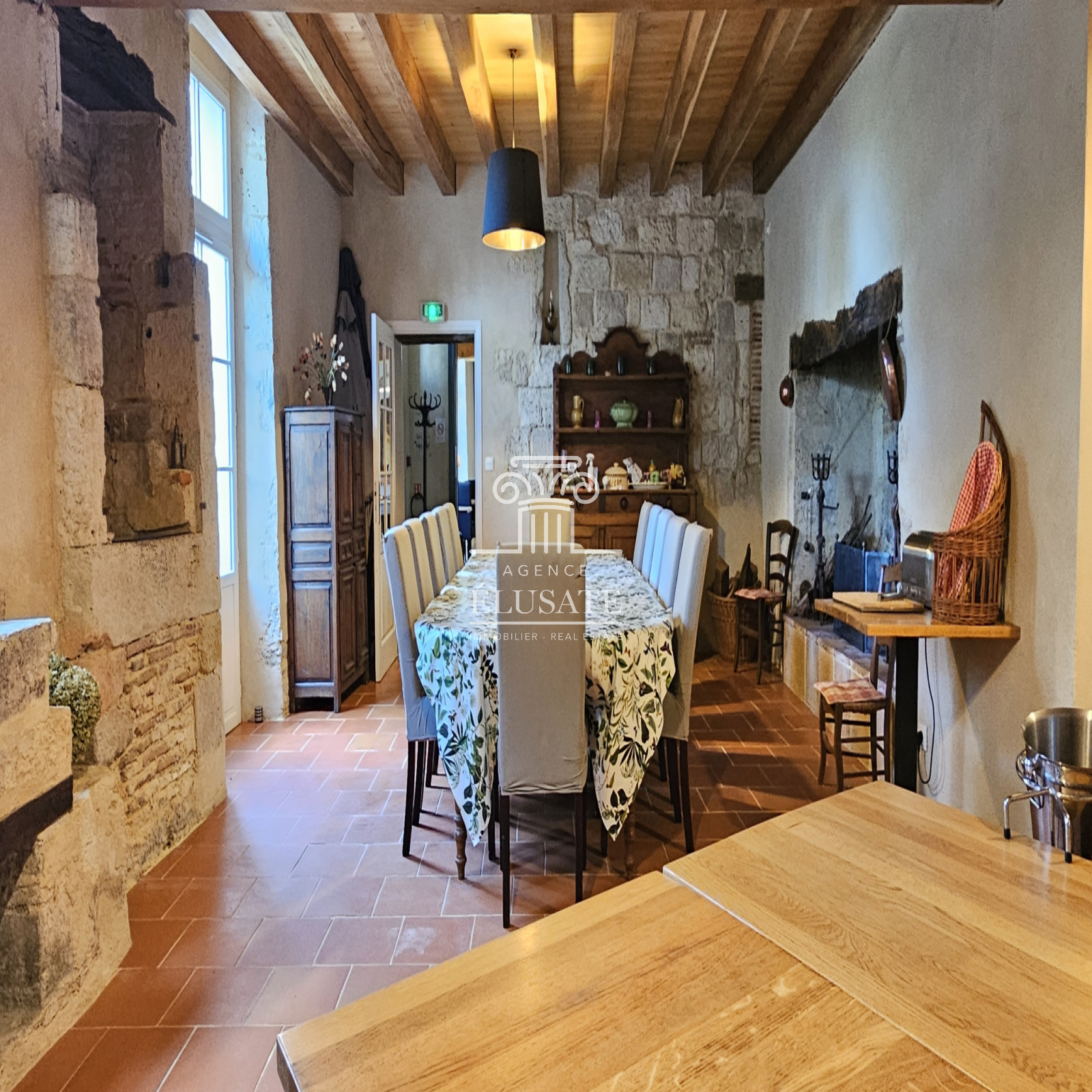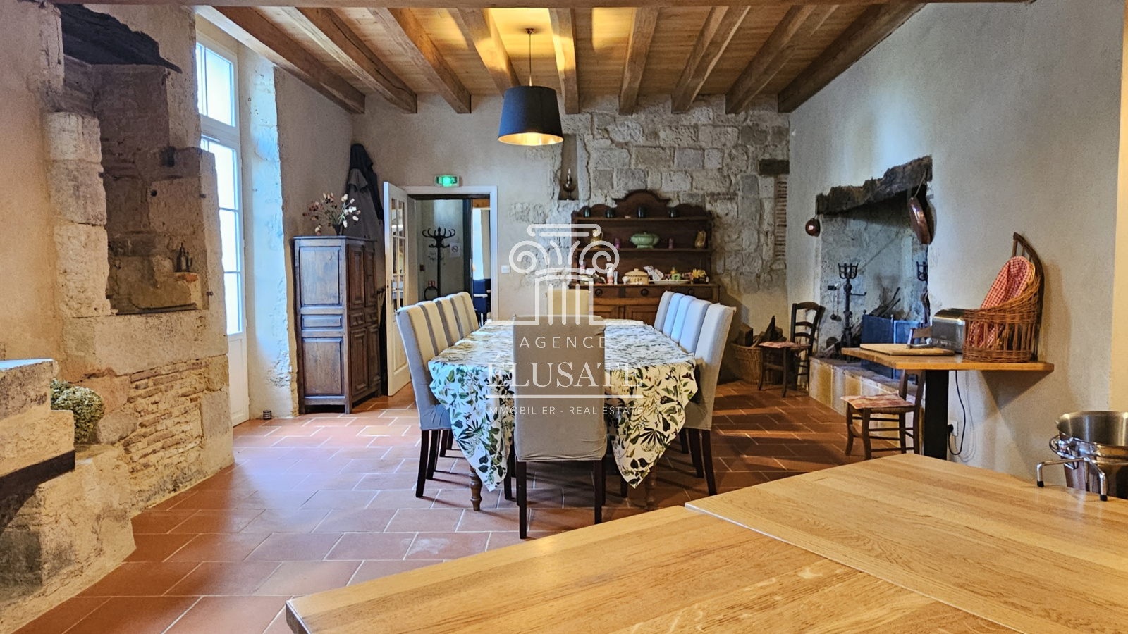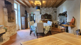 Une imposante salle à manger prolonge cette convivialité, offrant des éléments remarquable tels que son mur du XIIIe siècle, un puit, évier en pierre, et une large cheminée, une pièce parfaite pour accueillir des hôtes en quête d’authenticité.